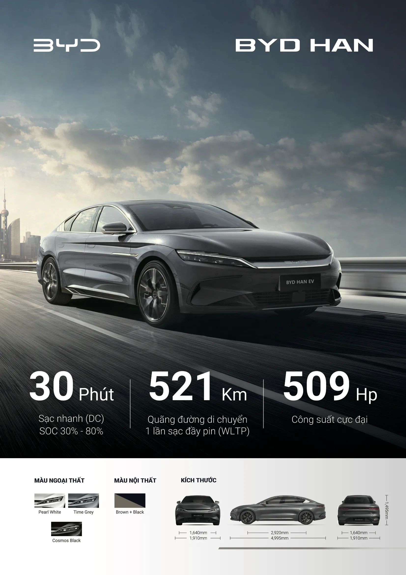 Mẫu sedan thuần điện BYD HAN chính thức được BYD giới thiệu tại Việt Nam với một phiên bản duy nhất, nhập khẩu nguyên chiếc từ Trung Quốc, giá bán 1,489 tỉ đồng. Xe có kích thước tương đương các mẫu sedan hạng sang như BMW 5-Series hay Mercedes-Benz E-Class, đi kèm khả năng di chuyển hơn 520 km mỗi lần sạc đầy.