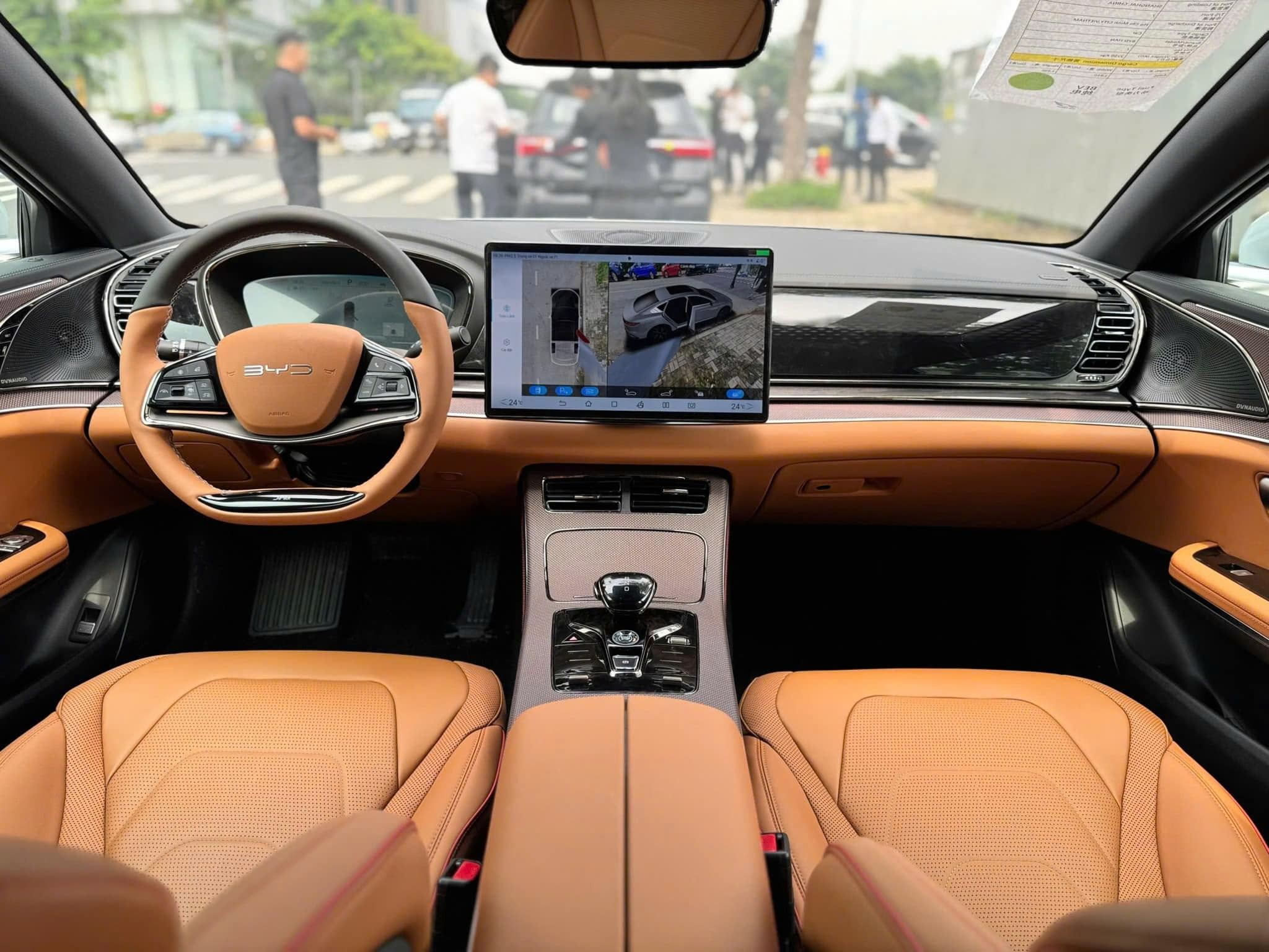 Bên trong, BYD HAN gây ấn tượng với chất liệu da Nappa, chi tiết ốp carbon, và khu vực trung tâm nổi bật với cần số BYD Heart cùng màn hình xoay 15,6 inch. Xe trang bị hệ thống đèn nội thất 128 màu, điều khiển giọng nói, sạc không dây và âm thanh Dynaudio 12 loa.